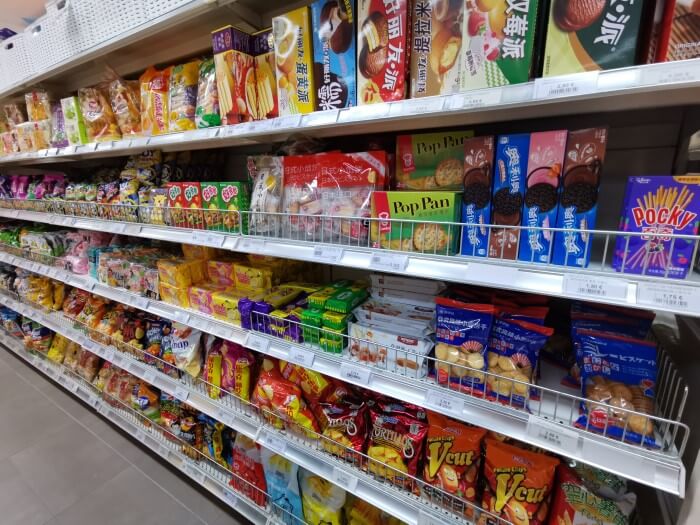 Pasillos con bebidas y con dulces y patatas iguales que las que se encuentran en los supermercados de China…
