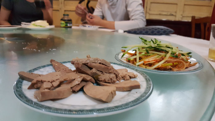 Nosotros nos comimos un menú tradicional para 2 personas con un pato entero, un menú muy contundente que incluía aperitivos como los hígados de pato, los cartílagos y unos rollitos. Posteriormente te avisan para que vayas a ver cómo preparan tu pato, enseguida te lo sirven en la mesa y a disfrutarlo. Nuestra sorpresa fue que nos sirvieran más tarde los huesos del pato fritos. ¡A jorge le chiflaron! ¡Aquí todo el pato lo aprovechan y está todo buenísimo!