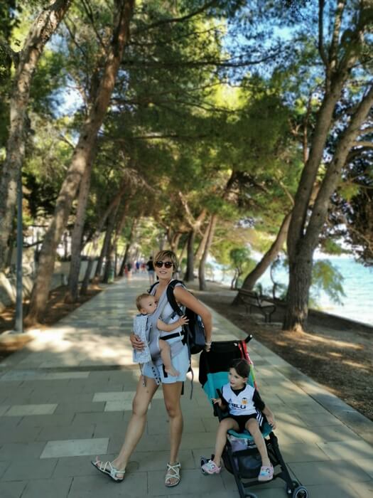 Llevábamos la silla de paseo para llevar a nuestra hija mayor y la mochila portabebés para llevar al bebé, un gran acierto para que el paseo fuera rapidito y ninguno se cansara. En la playa aparcamos el carrito bajo un árbol ya que al ser de piedras es imposible andar con la silla.