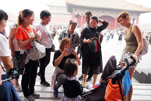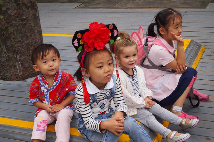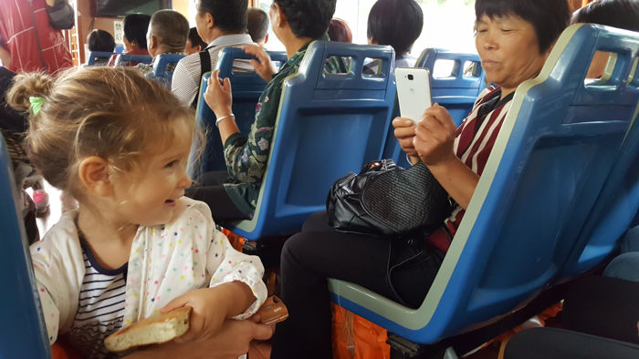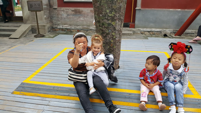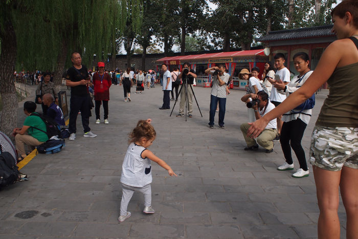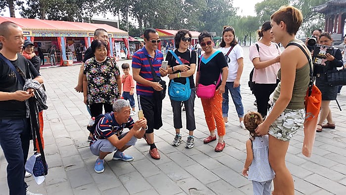 Porque era muy dificil avanzar, nuestra pequeña parecía una famosa, todo el mundo la quería fotografiar y los niños jugar con ella. La verdad que impacta mucho que llame tanto la atención a los chinos, será que no es muy normal ver a niños tan peques occidentales o su cara de traviesa y el color de su pelo también sería alguna de las razones por las que recibía todas las miradas y sonrisas chinas.