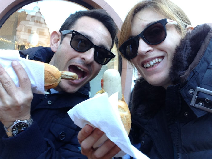 Llegamos al medio día a nuestro hotel en Offenburgo, así que rápidamente descargamos las mochilas y nos subimos de nuevo al tren para ir a Friburgo. En 30 minutos llegamos a nuestro primer Mercado Navideño del viaje y nos encantó (aún no habíamos visto los de Estrasburgo…). Comimos nuestras primeras bratwurst (salchichas) pero con agua ya que nos fue imposible encontrar un puesto con cerveza. Un paseo por la ciudad y a hacernos la típica foto con el tranvía recordando nuestro trabajo.