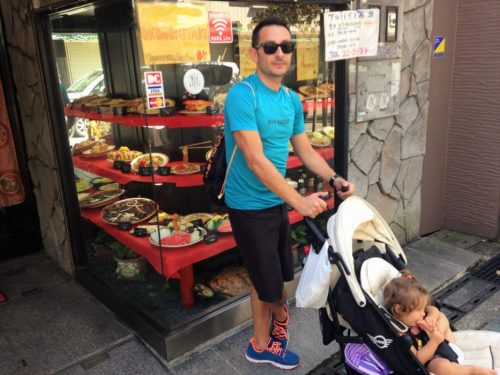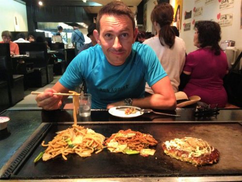 Atravesando el parque de Nara repleto de ciervos volvimos a la calle principal Sanjodori St. Decidimos comer en uno de los primeros restaurantes que encontramos en la calle y nos gustó mucho, Okonomiyaki restaurant. En cada mesa había una plancha para que se terminara de hacer la comida y se mantuviera caliente, probamos la Okonomiyaki típica de la zona (una especie de pizza japonesa con muchos ingredientes pero parece más una tortilla que una pizza), unos fideos y unos udon deliciosos. Este tipo de restaurante es algo peligroso para los niños pequeños, pero puedes pedir que te apaguen la plancha, en nuestro caso la pequeña estuvo tranquila en el carro y no hizo falta. La comida rondaría los 25€.