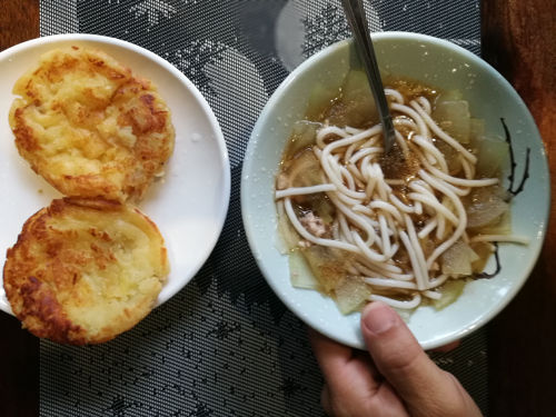 ¡Si! el hotel dispone de una cocina y un comedor donde preparan desayunos muy ricos y con previo aviso también pueden prepararte la comida, para cenar si que la tienen cerrada. Nosotros comimos en el hotel un día y todo muy bueno, fresco y barato: gyozas, dumplings, sopas, arroz…