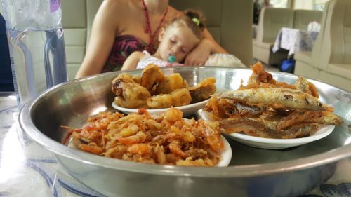 Durante la travesía puedes comprar bebidas e incluso pescado frito para picar algo mientras esperas la comida que te incluyen gratis. La comida incluida poco merece la pena, es el típico taper de arroz y carne recalentado que no vale nada… Así que recomendamos llevar algo de comida por si no os gusta lo que os dan y sobretodo para los niños.