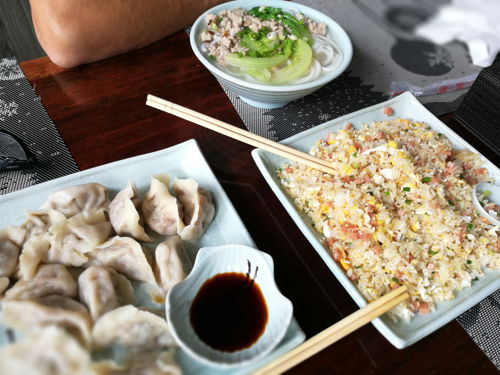 Conseguimos averiguar que se podía ir andando a una zona con más alojamientos y algo más viva que la nuestra. Allí se puede elegir entre más de 5 restaurantes distintos de comida china. Una de las tardes antes de anochecer cogimos el camino entre los arrozales y en menos de 15 minutos andando llegamos a esta zona. A la vuelta, ya de noche, tuvimos que caminar a la penumbra con la linterna del móvil para guiarnos, pero no es para nada un camino peligroso. La otra opción es coger taxi y bajar hasta la ciudad de Guilin donde encontrarás mayor variedad de restaurantes, el taxi ronda ida y vuelta unos 35-40 Yuanes (4€).