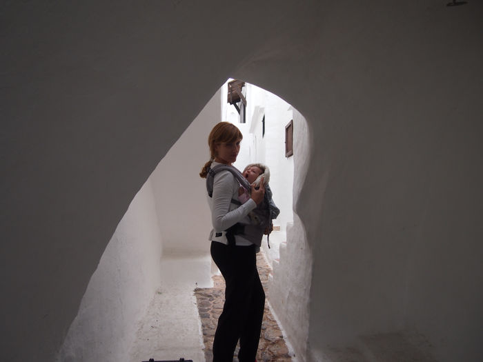 - Visitando Benibeca, un pequeño pueblo de pescadores de casitas blancas donde perderte entre sus callejuelas. Elegí la mochila portabebes Ergobaby con el adaptador porque todavía es muy pequeña y no puede llevar tan abiertas las piernecitas. Con el carro hubiera sido imposible recorrer el pueblo ya que hay calles muy estrechas y escaleras.