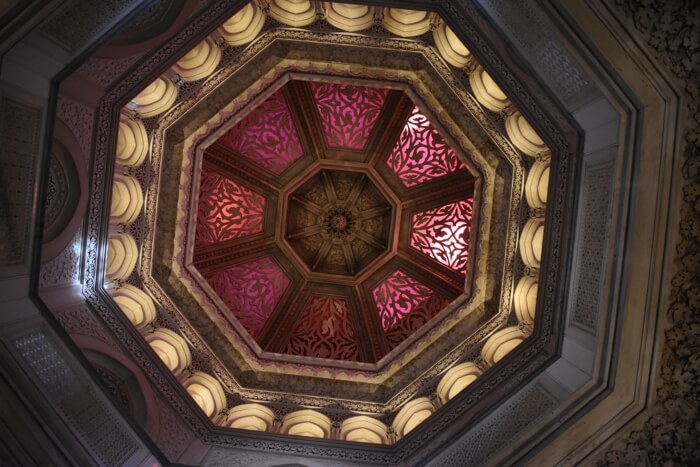 Su interior y decoración es un auténtico espectáculo. Combina influencias góticas, indias y mudéjares, incorporando motivos exóticos y vegetales que se extienden de forma armónica hacia el exterior; con sus pasillos de arcos y columnas que acentúan el efecto de profundidad, su cúpula de madera decorada con estuco y su fuente de mármol en el atrio principal…