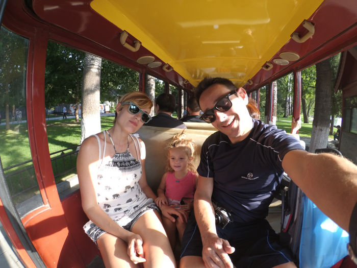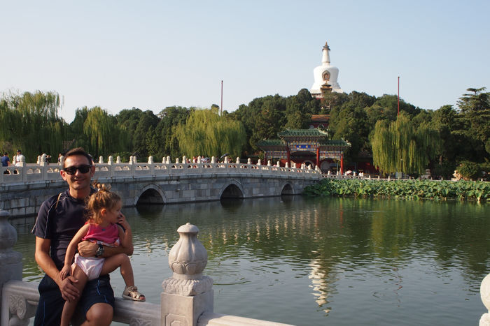 Y llegamos al increíble Parque de Beihai, la entrada cuesta 10 Yuanes y se encuentra abierto de 6.30 a 20 o 21 horas. Es un parque para disfrutar sin prisas, pasear o alquilar una barquita a pedales. Pero nosotros no teníamos mucho tiempo y con la niña era imposible avanzar rápido así que vimos pasar el típico trenecito eléctrico y nos subimos por 10 Yuanes cada uno. Nos llevó hasta la Puerta Sur para acceder a la Isla de Jade con su templo tibetano construido para la visita del Dalai Lama, de 36 metros de altura, y a la Ciudad Circular que alberga la mayor urna de Jade del mundo. Nosotros nos conformamos con hacernos la foto con el puente y con el Templo de fondo.