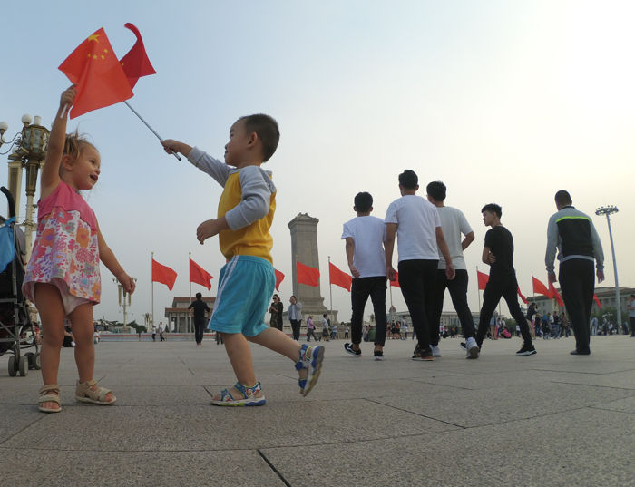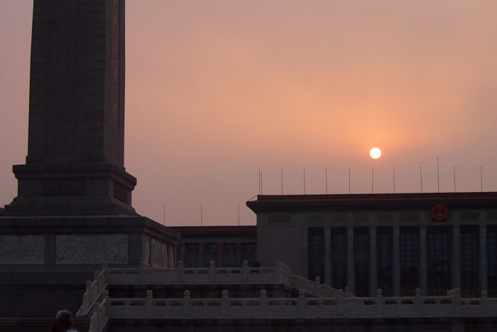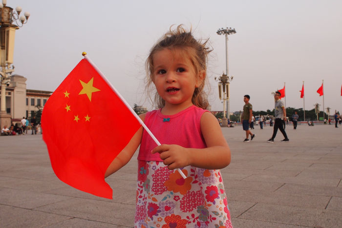 ¿Y por qué la disfrutó tanto? Le regalaron una bandera de china y enseguida un niño se le unió a sus juegos, era un espectáculo verlos corretear, saltar, gritar y mover la bandera en una de las plazas más grandes y más conocidas del mundo ante los ojos de todos los espectadores chinos. Así dejamos pasar el tiempo, viéndola disfrutar, hasta que hicieron la bajada de bandera y cayó el sol. Es uno de los momentos que más recordaremos de nuestra estancia en Pekín, verle disfrutar así es lo que más valoramos desde que somos tres viajando.