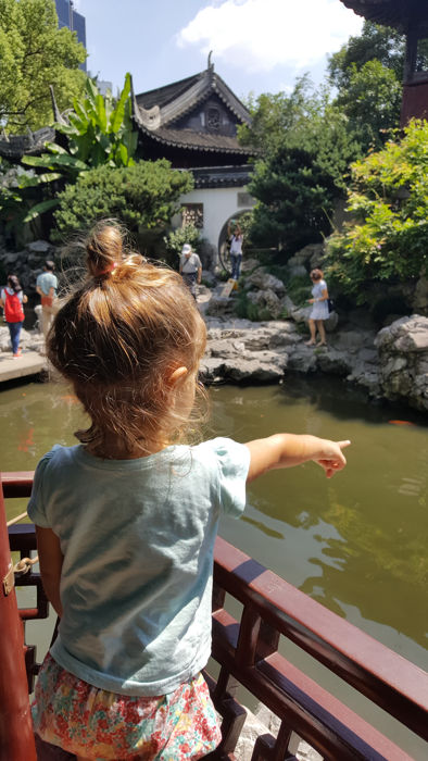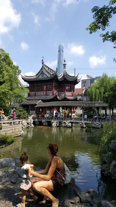 - Y por fin visitar el precioso Jardín de Yuyuan (o llamado también Yu Garden). Pasamos un agradable rato en familia, descubriendo sus jardines, lagos y sobretodo viendo los pececitos. Es un lugar para relajarse y dejar pasar el tiempo mientras los niños se lo pasan bomba viendo los peces. Además impacta mucho el gran contraste al admirar su arquitectura tan tradicional china y de fondo observar los grandes y modernos rascacielos. El precio de la entrada es de 40 Yuanes. Y es un imprescindible de Shanghái en un día con niños.
