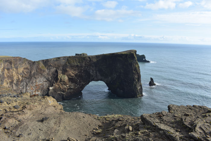 Una vez allí podrás apreciar los acantilados que nos presentan el salvaje océano Atlántico, mientras que a nuestras espaldas queda el casquete del glaciar Mýrdalsjökull. Además del faro lo más característico es el Arco de Dyrhólaey, un espectacular arco de piedra de 120 metros de altura. Esta zona es accesible para ir con niños. De aquí sale un sendero para bajar hasta la playa, pero no hace falta bajar por él, porque si continuas la carretera encuentras otro parking que te acerca a esta parte de la playa. Este parking dispone de baños pero de pago.