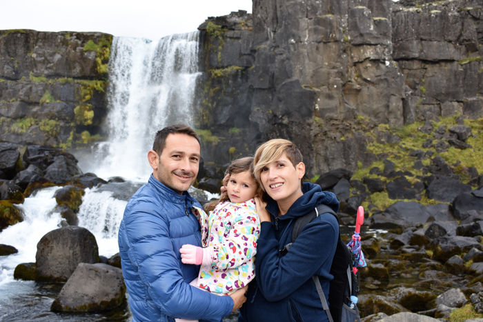 No debes perderte la ruta hasta la cascada de Oxarárfoss, es de 1 km y medio. Esta cascada se produce gracias a una profunda sima donde el río se lanza creando una fumarola de vapor de agua. El río al precipitarse en la falla de Almannagjá, provoca este bello espectáculo. Llegar a ella es posible con carrito de bebé, pero al final del camino hay que subir unas escaleras, se puede dejar ahí el carro y subir con el peque en brazos. En Islandia no te van a robar el carrito por dejarlo un rato aparcado, es uno de los países más seguros del mundo y en eso nos recordaba mucho a Japón. Si no quieres caminar, tienes un parking que se encuentra más cerca de esta cascada.