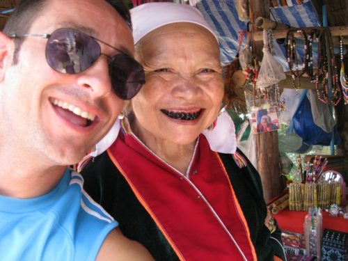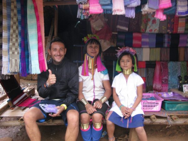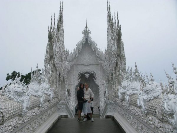 A las 9 nos recogió nuestro guía Nan, el día estaba un poco lluvioso pero venía preparado con un par de paraguas. Primero visitamos el Templo Blanco muy curioso porque tiene menos de 20 años y por dentro tiene pinturas de la guerra de las galaxias, superman, y otros superhéroes, además se colaboraba en su construcción comprando unos colgantes (30bahts) se firmaban y los colocabas para rellenar una especie de bóveda. Después fuimos al Templo de los monos, luego a Mae sai, pueblo fronterizo con Birmania donde pudimos ver en directo como un Tailandés se colaba en la frontera colgándose del puente, visitamos el mercado y luego comimos (teníamos la comida incluida en el tour). Después fuimos al Museo del Opio y al Triángulo de Oro, donde se ve Birmania, Laos, China y el rio que las separa, teníamos una ruta en barco por el rio pero como estaba lloviendo nos lo cambiaron por las mujeres jirafas que aunque no me daban mucha ilusión verlas mereció la pena porque no había ni un solo turista y eran muy simpáticas. Al bajar del coche de Nan a Jorge se le olvidó la cámara, pedí en el hotel que lo llamarán, se portaron muy bien tanto el hotel como nuestro guía y recuperamos la cámara.