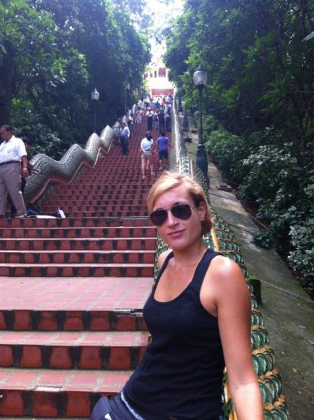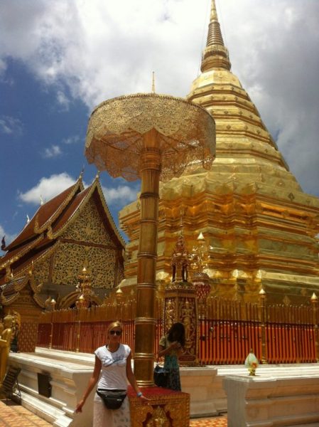 Hicimos el check out en el hotel y  fuimos andando hasta la puerta de la muralla Chang Puak donde se cogen los Songteos para ir a Doi Suthep, hay que esperar a que sean 10 personas y cuesta 100bahts i/v (2€) y te dan 1hora para visitar el templo. Entrar cuesta 30bahts (70ctms) y hay que ir con pantalón por debajo de la rodilla y con los hombros cubiertos, ya dentro entramos en una habitación donde había un Buda, nos preguntó de donde éramos, nos habló en español y nos bendijo echándonos agua, a Jorge le puso una pulsera y a mi un chico que había allí ya que los Budas no pueden tocar a las mujeres.