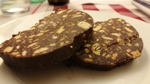Para acabar disfrutando unos maravillosos postres caseros italianos, nuestro preferido el salami de chocolate.