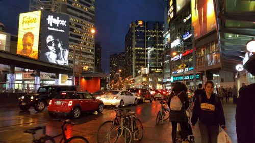 Al anochecer aprovechamos para visitar la zona comercial de Dundas, y maravillarnos con sus luces y su ambiente que nos recordaba a nuestra reciente visita a Times Square durante nuestra estancia en Nueva York.