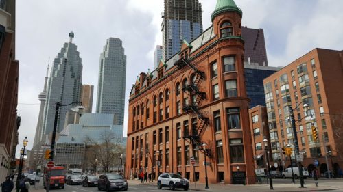 Muy cerca de St. Lawrence Market se encuentra un edificio emblemático de la ciudad, el Edificio Gooderham llamado comúnmente el Flatiron de Toronto, declarado desde 1975 Sitio Histórico Nacional. ¿Por qué lo llaman Flatiron? Por su forma delgada acabada en cuña triangular, similar al edificio Flatiron de Nueva York que se construyó posteriormente y con mucha más altura.