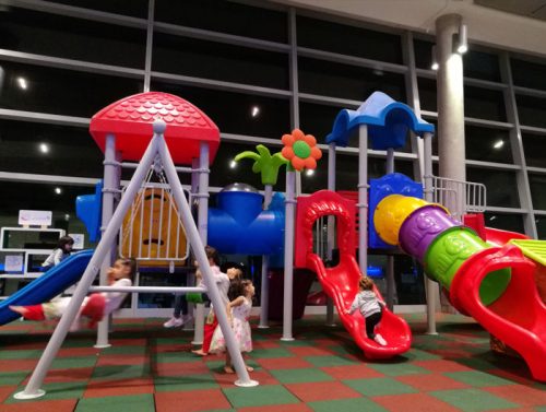 En nuestro viaje a China la escala fue en Abu Dhabi y tuvimos la suerte que justo embarcamos tanto a la ida como a la vuelta muy cerca de la zona de niños donde disfrutó y se cansó tanto que subió al avión para seguir durmiendo.