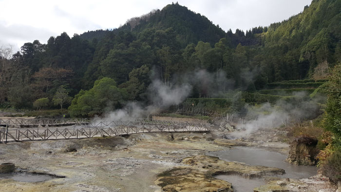 En el Valle de Furnas encontramos las humeantes fumarolas que proceden de las tierras calientes que rodean el lago. Esta humeante tierra se conoce como Caldeiras. Es muy curioso observar los agujeros en los que entierran las ollas, tapándolas con tierra caliente para cocinar el típico cocido de Furnas con su receta centenaria aprovechando el calor de la caldera volcánica, mientras percibes el olor sulfuroso, que como decía nuestra pequeña «¡que asco!» y es que realmente huele a huevo duro.