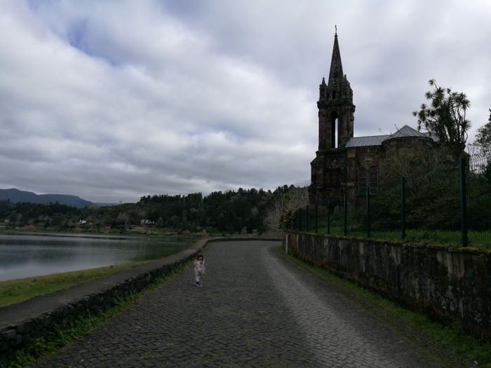 Bordeamos el lago hasta la parte sur de Lagoa das Furnas y paseamos por su orilla y su jardín. Allí se encuentra el Parque Mata-Jardim José do Canto. Este jardín es de pago y se puede acceder para visitar su Capilla y el aspecto salvaje de su flora, también tiene una pequeña cascada. La entrada cuesta 3€ y se puede adquirir una entrada conjunta para visitar también el centro de interpretación por 4.50€, se adquieren en el centro de interpretación que se encuentra siguiendo el camino. Nosotros no entramos ya que desde el camino puedes admirar la bonita y curiosa Capilla e incluso parte de su flora y fauna como los pavos reales.